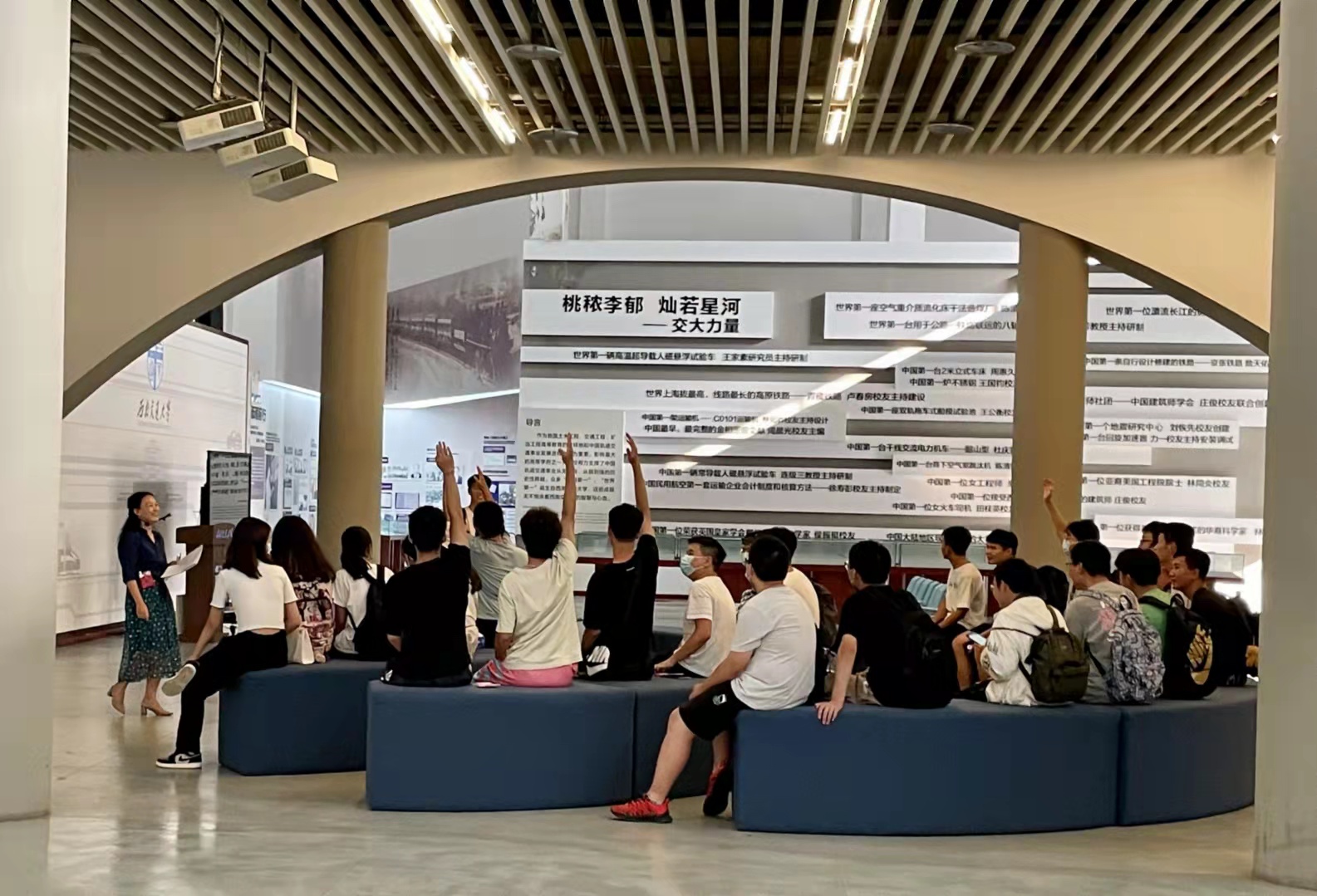 接着,走过装饰有校徽和交大成立时间的影壁后,同学们随着讲解员进入以机车为中心的校史馆大厅。机车右侧的白石上刻有“竢实扬华,自强不息”的交大精神,左侧则是“精勤求学,敦笃励志,果毅前行,忠恕任事”的十六字校训。随后跟随着讲解员看到了记录有交大发展的浮雕墙,墙上来自五个办学地点的泥土和为交大贡献力量的先辈浮雕像给我们留下了深刻印象。过了浮雕墙,同学们一同经历了八个篇章的交大发展历程,分别为榆关始创、复校唐山、成就斐然、烽火薪传、迎接曙光、砥砺前行、创业峨眉、蓉城新篇。