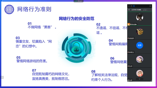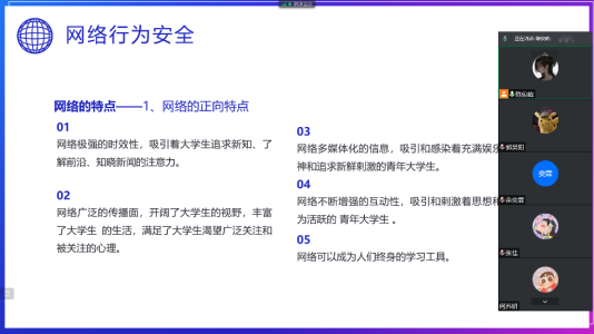 主讲人陈俊峰同学从网络行为安全、网络行为准则、网络交易安全和网络交友安全四个方面讲述了作为一名大学生该如何正确上网以及怎样保护个人隐私等知识。