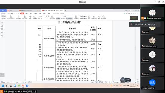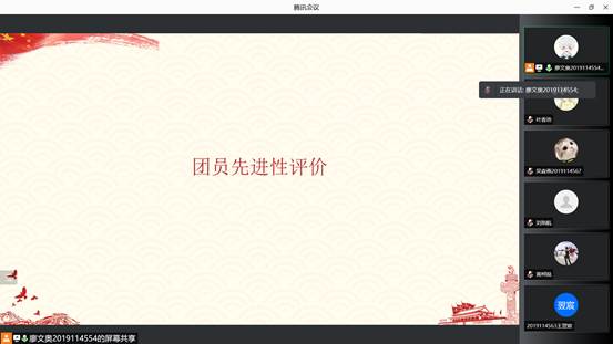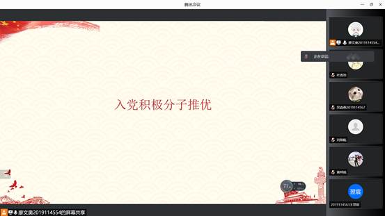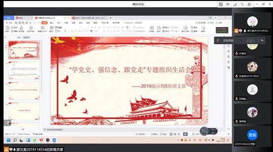 2021年11月20日19:30,2019级应物五班在腾讯会议上召开了2021-2022学年第一次专题组织生活会暨教育评议及推优大会,应物五班全体同学参加了本次会议,本次会议以线上方式进行,并由班级团支书廖文奥同学主持。