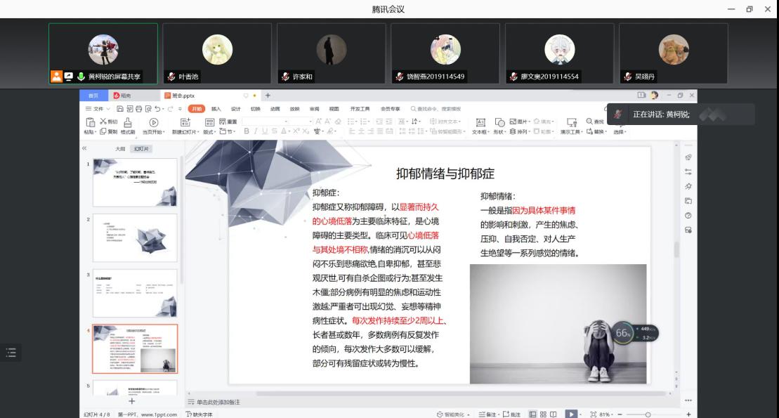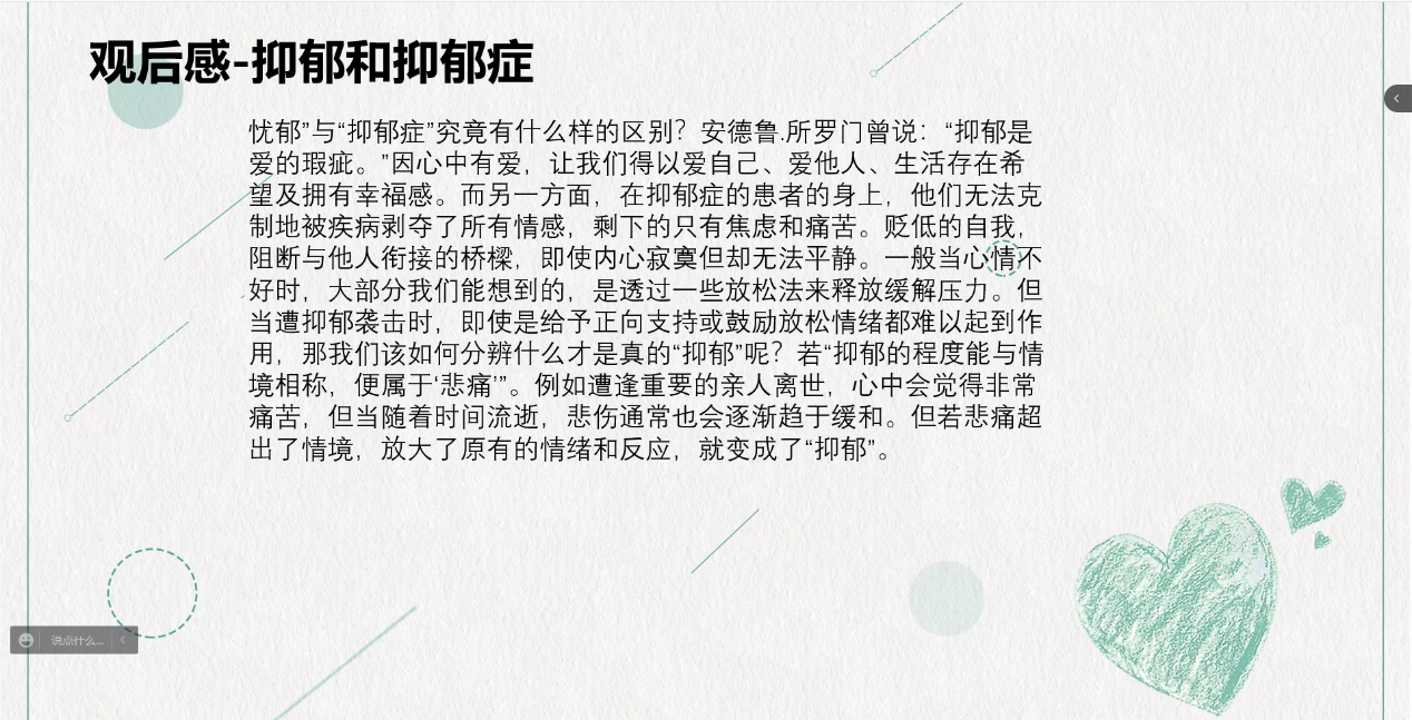 该纪录片面向抑郁高危群体,走近真实的抑郁疾病患者,并追访医学界、科学界专家与学者,希望从个人、家庭、社会多角度呈现对抗抑郁的经验、路径与方法。 通过观看视频,同学们认识到不要污名化、妖魔化抑郁,不要认为抑郁症患者只是矫情、懒惰、自寻烦恼,我们应该正确、客观全面地看待抑郁以及抑郁患者群体。