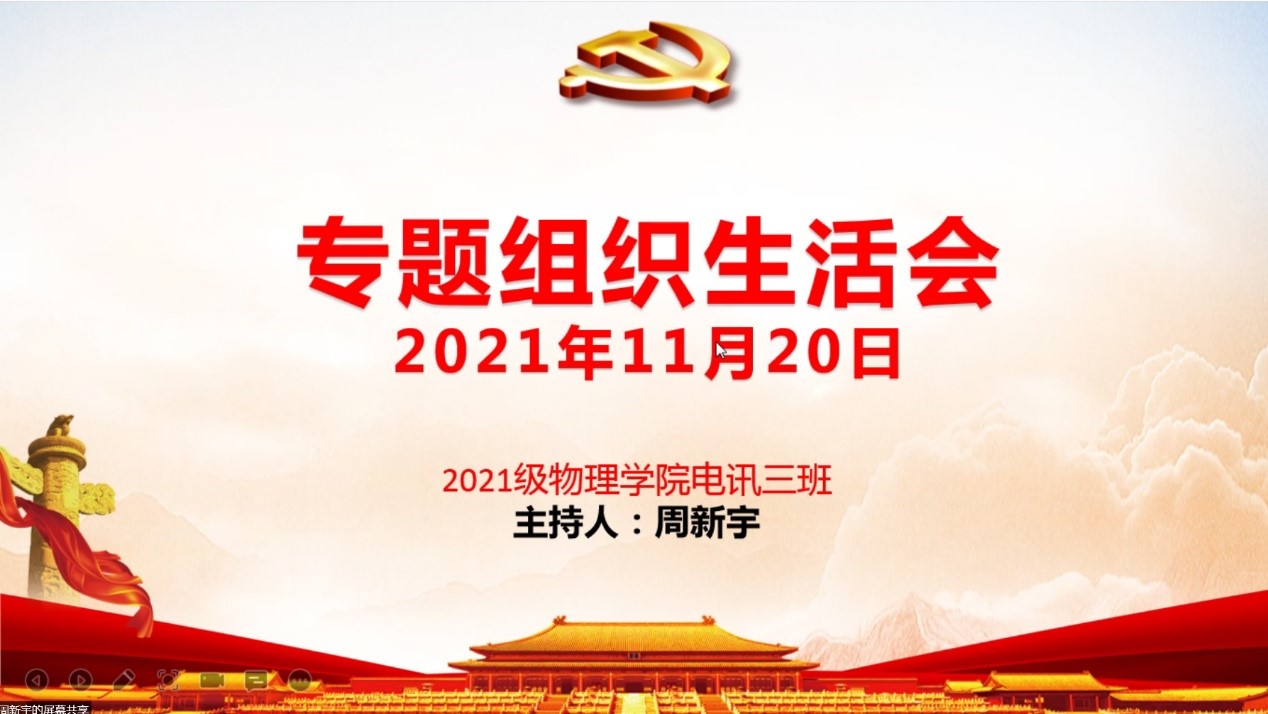 为提升班级凝聚力,帮助同学们不断地提升思想修养,物理科学与技术学院21级电讯三班于2021年11月20日开展专题组织生活会。因防控疫情的需要,此次会议线上举行,会议由团支书周新宇主持,班级全体同学参加。
