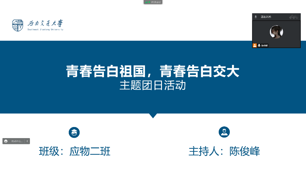 10月7日下午,物理科学与技术学院2021级应物2班团支部于线上开展“青春告白祖国,青春告白交大”主题团日活动,应物2班全体同学参与,会议由团支书陈俊峰同学主持。