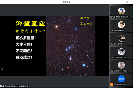 为了让同学们了解脉冲星的发现故事,探秘脉冲星的奇特性质,畅想脉冲星对人类星际航行的导航和可能的科幻武器。物理科学与技术学院学生会于2022年12月13日19:30在腾讯会议与bilibili平台同步直播物理科学与技术学院银河之眼精品活动《星际航行的灯塔——脉冲星》讲座。讲座由西南交通大学物理科学与技术学院副院长(主持工作)贾焕玉教授进行讲授,物理科学与技术学院学生积极参与了本次讲座。