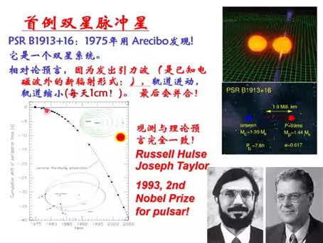 讲座第二部分——脉冲星观测性质。首先,贾焕玉对观测超新星的设备进行了详细说明。然后,贾焕玉介绍了世界首例发现的双星脉冲星——PSR B1913+16,并且强调了它的重大物理意义:首次发现双星中的脉冲星(恒星演化);引力波第一次的观测证据;首次精确确定中子星的质量;确认广义相对论是可以描写强引力相互作用的理论。接着,贾焕玉讲述了再加速脉冲星,脉冲星三大发现和师生合作的典范,脉冲星产生辐射的方式,脉冲星的分类,脉冲星的周期分布、空间分布、质量、磁场、密度等内容。