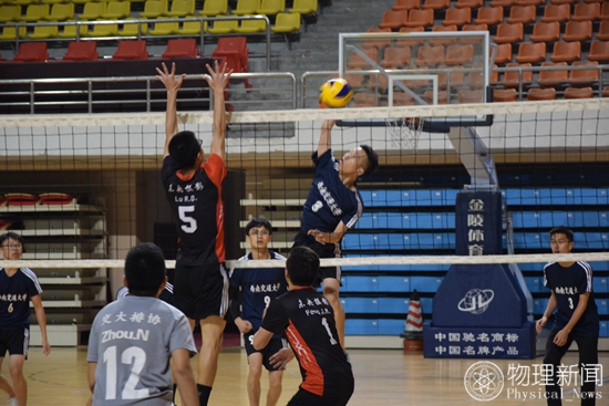 比赛刚开始,材料学院排球队凭借几个精彩的发球使物理学院排球队出现失误,材料学院取得开门红。而在你来我往几个回合后,物理学院队员逐渐找回手感,在李书华同学连续扣杀成功后,物理学院队员逐渐起势。比赛愈演愈烈,围观的同学们连连发出“注意防守”、“好好发球!”的呐喊声,声声呐喊洋溢出青春的活力;比赛间短暂休息时队友间的击掌和口号,是竞技体育的精神和魅力。每一个关键的得分后,都有来自场下啦啦队们的欢呼。他们喊出队内口号,带给运动员们力量,体现出竞技体育独有的氛围。