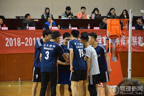 在中场休息时,双方队长把队员们召集在一起,从上半场比赛中总结失误及改进措施。即使物理学院比分稍落后于对手,但他们始终保持积极的比赛态度,他们的行为告诉我们体育不只有输赢,它更在于输赢背后拼抢每一个球的努力,与队友的合作,以及从比赛中收获的友谊。