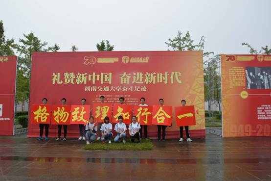 2019年10月1日8:00,西南交大图书馆正门前,庄严的国歌准时响起,五星红旗迎风飘扬,它身后是广袤的蓝天,它身前是应物6班同学的注目礼。升起的不仅有肃穆的国旗,还有莘莘学子的责任在肩,奏响的不仅有豪迈的国歌,还有生逢其时的时代呼唤。“立志求真,感恩报国”,是同学们的心声,亦是对祖国的许诺。
