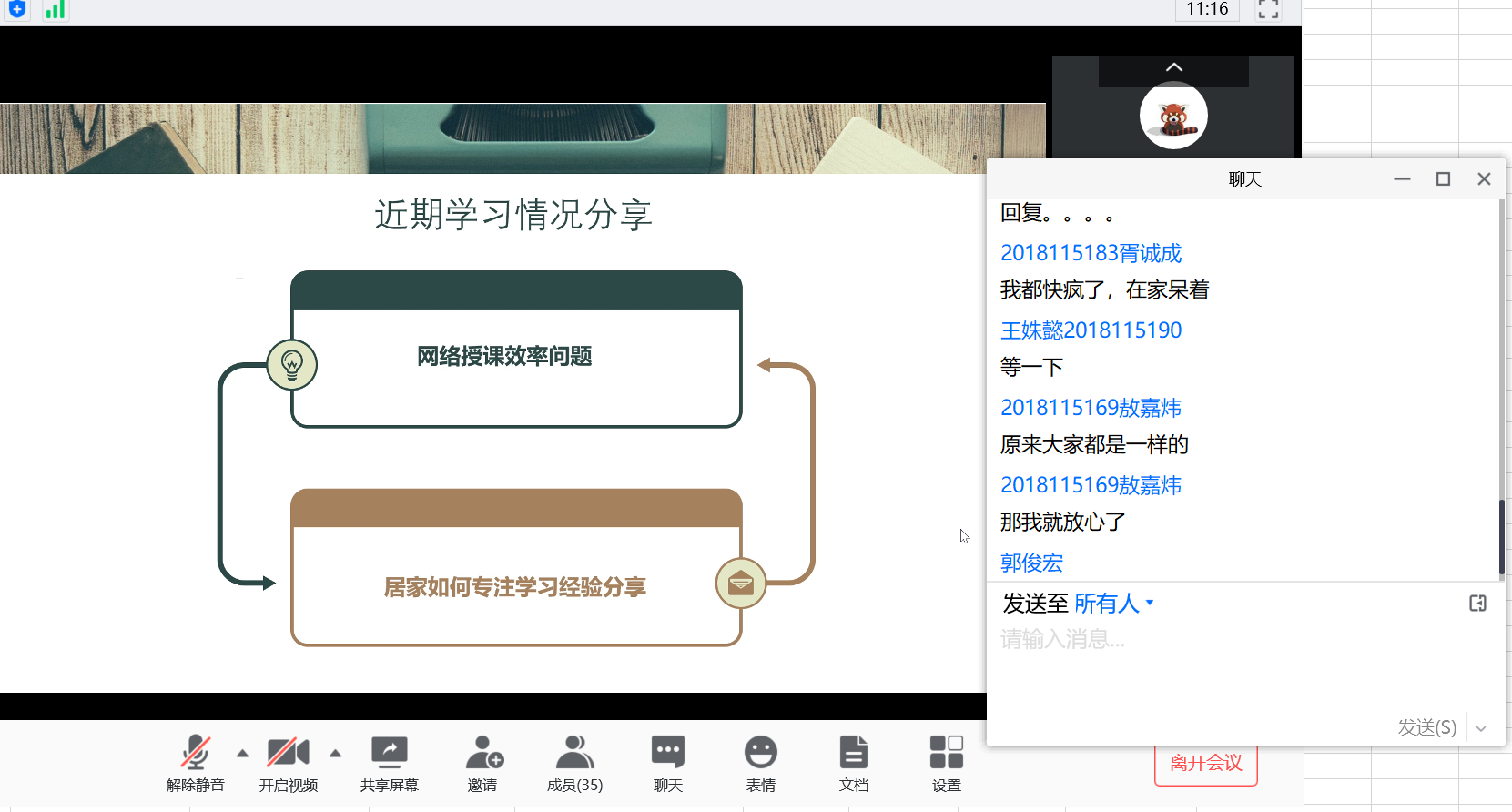 会议开始,学习委员王祚同学对班级大一、大二上学期的成绩进行了对比总结,并对往届的保研情况进行分析。之后,两位学习进步显著的同学分享了他们的学习经验。随后,全班同学逐一对居家上网课的状态发表自己的看法,班长对同学们的问题作了总结并且给出意见。