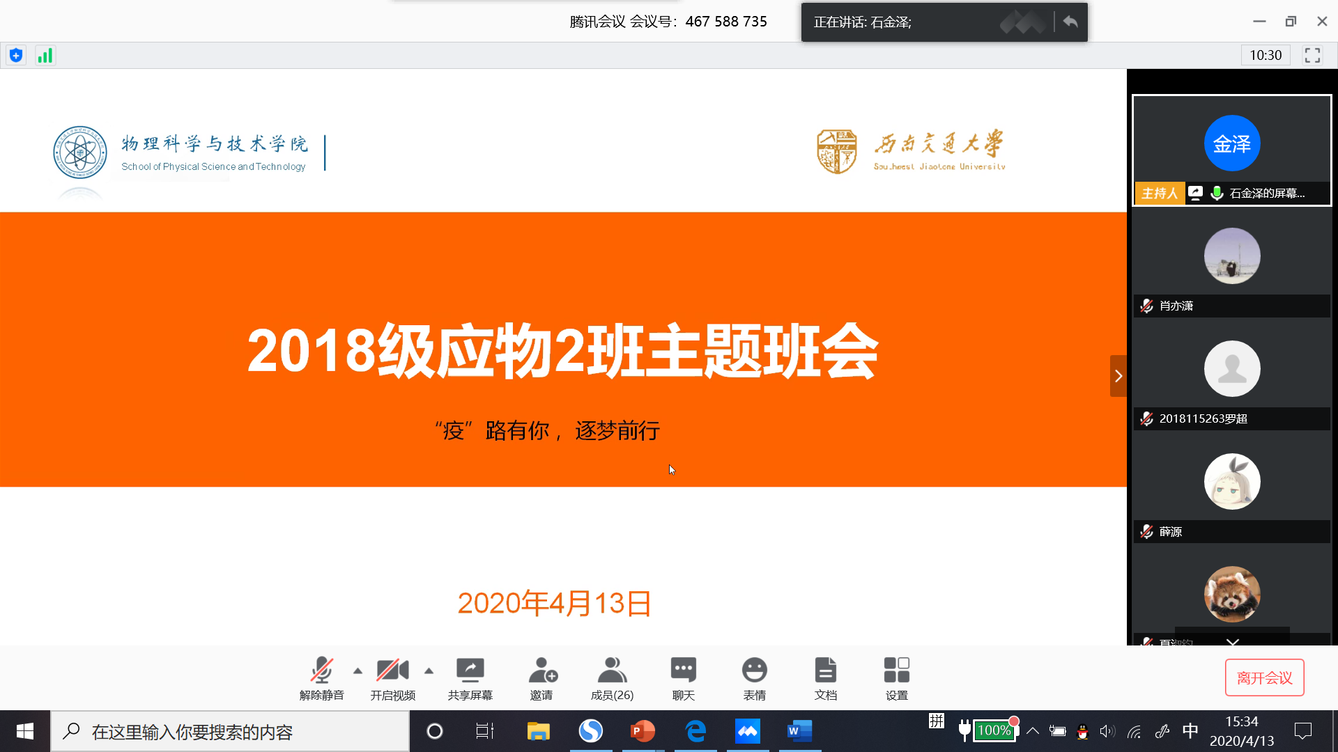 首先,石金泽同学提到受疫情影响,线上学习已经进行到了第八周,提醒各位同学在特殊时期做好个人防护。然后引用了习近平总书记在北大援鄂医疗队回信中对青年的称赞,表示在这次疫情当中我们新青年展现出了高度的担当和责任感,“不畏艰险,冲锋在前”,我们这些新青年们用汗水浇筑青春,以实际行动证明自己堪当大任。而中国在全球抗疫中彰显大国担当,对内严防扩散,积极抗疫,对外开展国际合作,携手共战,班长通过疫情防控引导同学们进一步坚定中国自信。