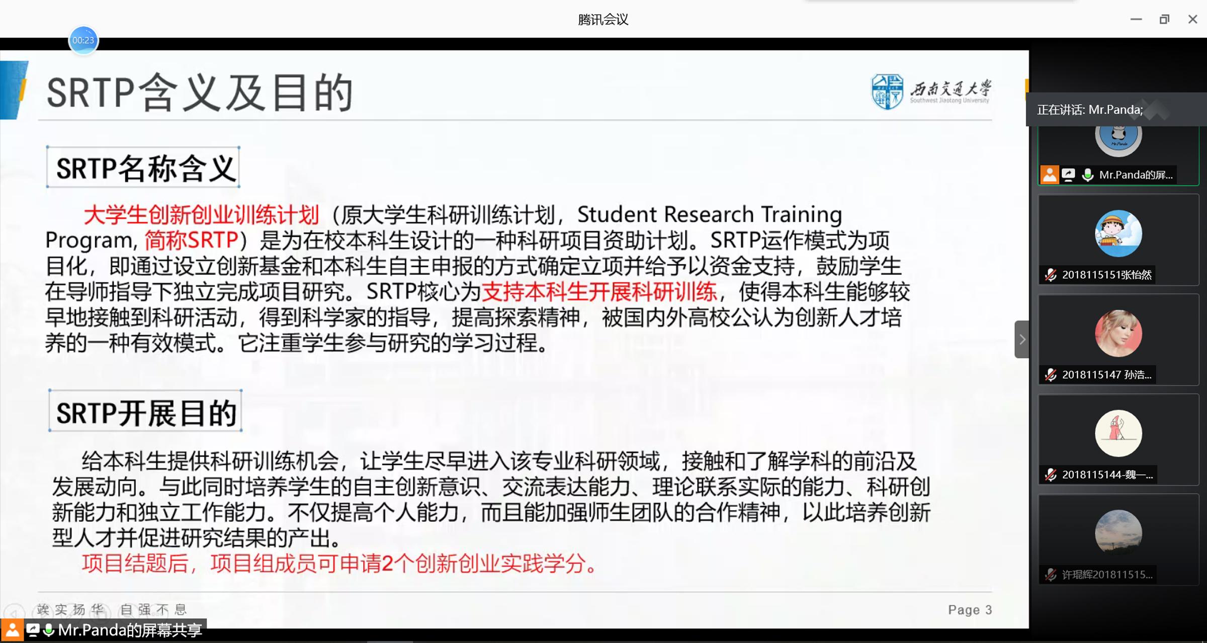 接下来,潘国勋同学详细介绍了大学生创新创业训练计划(即Student Researching Training Program,简称SRTP)。SRTP是为在校本科生设置的一种科研项目资助计划,旨在给本科生及早进入科研领域的机会,接触了解学科前沿发展,并提高个人科研能力,培养创新意识,加强团队合作精神。