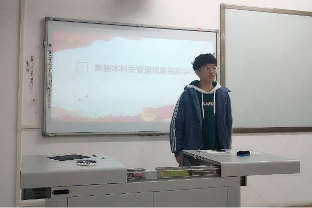 之后班长刘大鹏组织全体同学共同学习新版本科生管理规章制度,这与同学们的生活息息相关,务必要重视。会上主要强调了奖惩制度和违规电器的问题,为宿舍安全敲响了警钟。