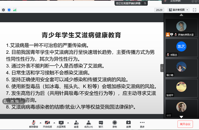 首先,罗旖同学让大家观看了一个“大话艾滋”的视频,视频生动有趣地向同学们介绍了关于艾滋病的相关知识。看完视频后,罗旖同学对大家继续展开艾滋病健康教育,并且让同学们完成了一个调查问卷。