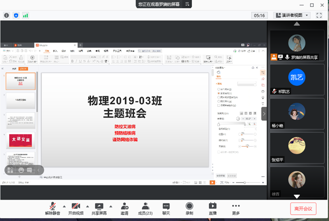 2021年3月25日下午四时,2019级应物3班在网络会议上召开了大二学年第三次主题班会。本次班会由宣传委员罗旖主持,除一人请假外,三班其余23人均参加了此次班会。