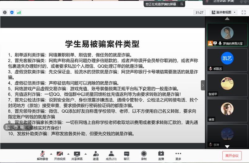 最后,罗旖同学向大家介绍了网络诈骗,给大家看了很多学生容易被骗的案例,以及让全体同学关注“熊猫反诈”的微信公众号,防范网络诈骗。