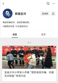 然后,顾晏戎又从生活实例出发,讲述发生在我们周围的电信诈骗事件,也让同学们意识到电信网络诈骗的危害,因此要在平时的日常生活中注意保护好自身的网络个人信息。为了保障大家的电信安全,随后也要求各位同学都要关注“熊猫反诈”微信公众号,这样能够在当同学收到电信诈骗电话时,警方第一时间发送预警短信。