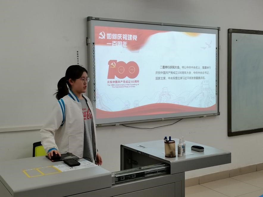 随后,刘兆媛同学讲解了如何庆祝建党一百周年:举行庆祝大会、召开理论研讨会和座谈会以及举办“不忘初心、牢记使命”的大型主题展览等等,通过这些方式全面、系统、生动地展示中国共产党百年的光辉历程、伟大成就和宝贵经验。