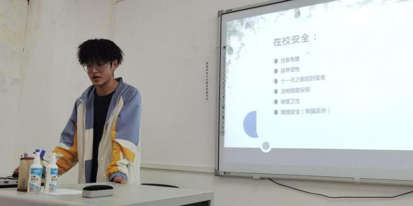 接下来,生活委员唐铭强调同学们在学校应严格遵守规章制度,尤其是清明节假日期间要注意安全;组织委员陈浩动员大家积极参与运动会,征集同学们对组织班级活动的意见;心理委员张龙煜介绍了熊猫反诈微信公众号,希望同学们明辨各种诈骗行为,避免上当受骗。