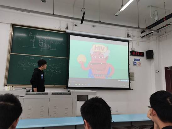 班长杨森浩通过幽默诙谐的语句,让同学们逐步了解传染病的传播途径以及危害。同时也通过一些有趣的短视频,增强了同学们的对传染病的了解。