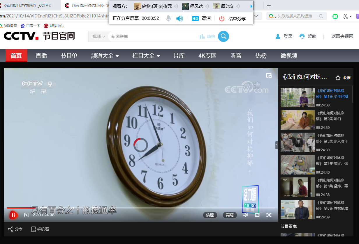 2021年11月22日晚7点,物理科学与技术学院2019级应用物理系三班的同学,在心理委员张婷蕙的带领下,通过腾讯会议集体观看了央视网节目《我们如何对抗抑郁》。通过观看该节目,同学们从个人、家庭、社会多个角度深入了解了抑郁症的影响,学习了一些对抗抑郁的经验与方法。