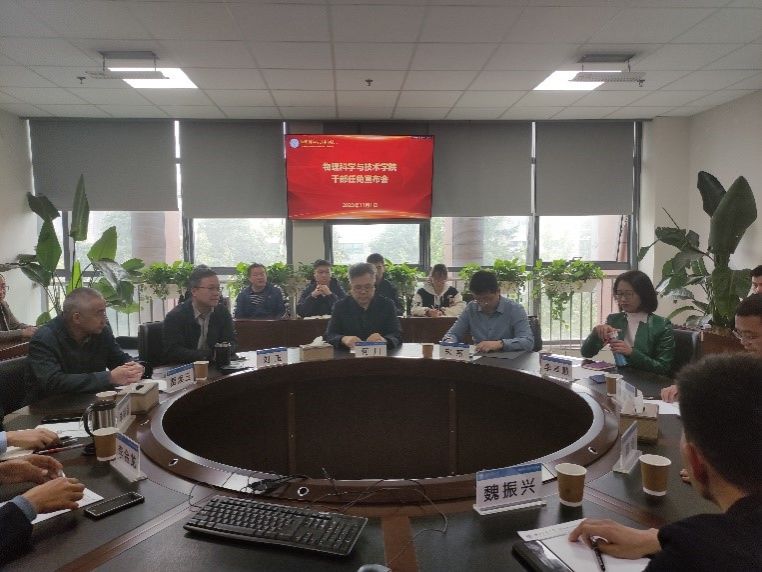 On the afternoon of November 1, 2023, a delegation led by He Chuan, a member of the university party committee and vice president, Song Xin, the executive deputy director of the party committee organization department, and Yan Pulong, the vice president of the party school, visited the School of Physical Science and Technology to announce official notifications regarding cadre appointments and changes. The meeting was attended by the entire leadership team of the school, representatives from the professorial committee, as well as heads of departments, research teams, and administrative offices. Yan Pulong presided over the meeting.