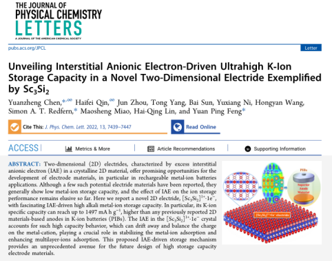 Important progress has been made in the research of high energy storage batteries by the Nanomaterials and Computational Physics Team of the School of Physical Science and Technology at Southwest Jiaotong University. Recently, Associate Professor Chen Yuanzheng of the team, together with Professor Simon A. T. Redfern from Nanyang Technological University and Professor Feng Yuanping from National University of Singapore, made important progress in the research of high energy density metal ion batteries and their energy storage mechanisms. The research results, titled "Unveiling Interstitial Anionic Electron-Driven Ultrahigh K-Ion Storage Capacity in a Novel Two-Dimensional Electride Exemplified by Sc3Si2," were published in the internationally renowned journal J. Phys. Chem. Lett. on August 6, 2022 (IF=6.888, Tier 1, https://pubs.acs.org/doi/full/10.1021/acs.jpclett.2c01888). They were also featured in the official media column of the Journal of Physical Chemistry as a hot topic.
