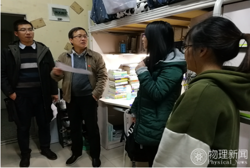 Senior year is a harvest season. In order to further understand the living conditions and electricity consumption of senior students, to better strengthen their awareness of safe electricity consumption, and to encourage graduates to take postgraduate entrance examinations, to better guide graduates'employment, Liu Yu—the Secretary of the Party Committee of the School of Physical Science and Technology , Tang Meijiang —the Deputy Secretary of the Party Committee, Men Manzhou—the Secretary of the Youth League Committee, Zheng Yan—a counselor for senior students, and Wu Jie—a counselor for junior students, visited the girls'dormitories of Grade 2015 of the School of Physical Science and Technology at 6:30 p.m. on November 20, 2018, having a cordial conversation with the students.