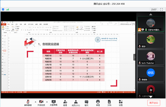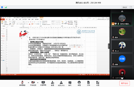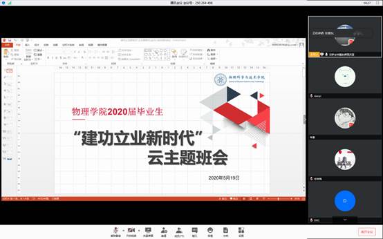 2020年5月19日晚7点30,物理科学与技术学院2020届毕业生“建功立业新时代”云主题班会在腾讯会议室250 264 498开展,学院党委副书记郭剑,研究生辅导员刘阳,本科毕业年级辅导员吴杰以及学院毕业年级本、研学生参加此次主题班会,班会由辅导员吴杰主持。