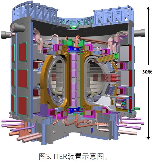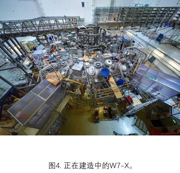 目前,国际上主要的托卡马克有:JET,JT-60U,DIII-D,AUG,Tore-supra,TEXTOR,TCV,KSTAR,以及由中国、美国、欧盟、日本、韩国、印度和俄罗斯七方共同出资建造的国际热核聚变实验堆(ITER,耗资约1000亿人民币,见图3)等;主要的仿星器有:LHD,W7-X(见图4),TJ-II,HeliotronJ等。目前在中国有4台托卡马克装置,包括中国科学院等离子体物理研究所的EAST,核工业西南物理研究院的HL-2A,华中科技大学的J-TEXT,清华大学的SUNIST,还有一台位于中国科学技术大学的反场箍缩装置KTX。在上个世纪70年代,核工业西南物理研究院曾探索过仿星器装置,但由于仿星器的复杂性,该装置没有取得成功。此后,中国的仿星器研究处于一片空白。仿星器装置作为一种优良的磁约束聚变装置,跟托卡马克相比,有许多优点。2015年德国W7-X仿星器点火成功,并在随后的放电中实现了长达30分钟的高温等离子体约束,这一成果轰动了世界。由此,仿星器的设计方案也被公认为是未来核电站聚变反应堆的发展方向之一。