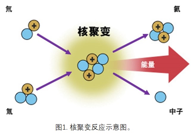 我们知道,当两个轻核克服库仑力聚合成一个较重的核,会发生质量亏损,根据爱因斯坦的质能关系E = m0c2,这将释放出巨大的能量,这就是核聚变(nuclearfusion)反应,见图1。研究发现,单位质量的氘核聚变反应释放的能量是单位质量的铀核裂变反应释放能量的4倍,因此聚变能是比裂变能更为巨大的一种核能。太阳及所有恒星释放的能量都来源于核聚变反应。人类在上个世纪50年代就实现了核聚变反应——氢弹,但氢弹是不受控的核聚变反应,若要把核聚变反应释放的巨大能量利用起来,就必须实现受控核聚变。实现受控聚变的方式主要有引力约束(太阳),惯性约束(激光聚变)和磁约束聚变(magneticconfinementfusion),而在地球上实现受控聚变的方式主要是后两种。