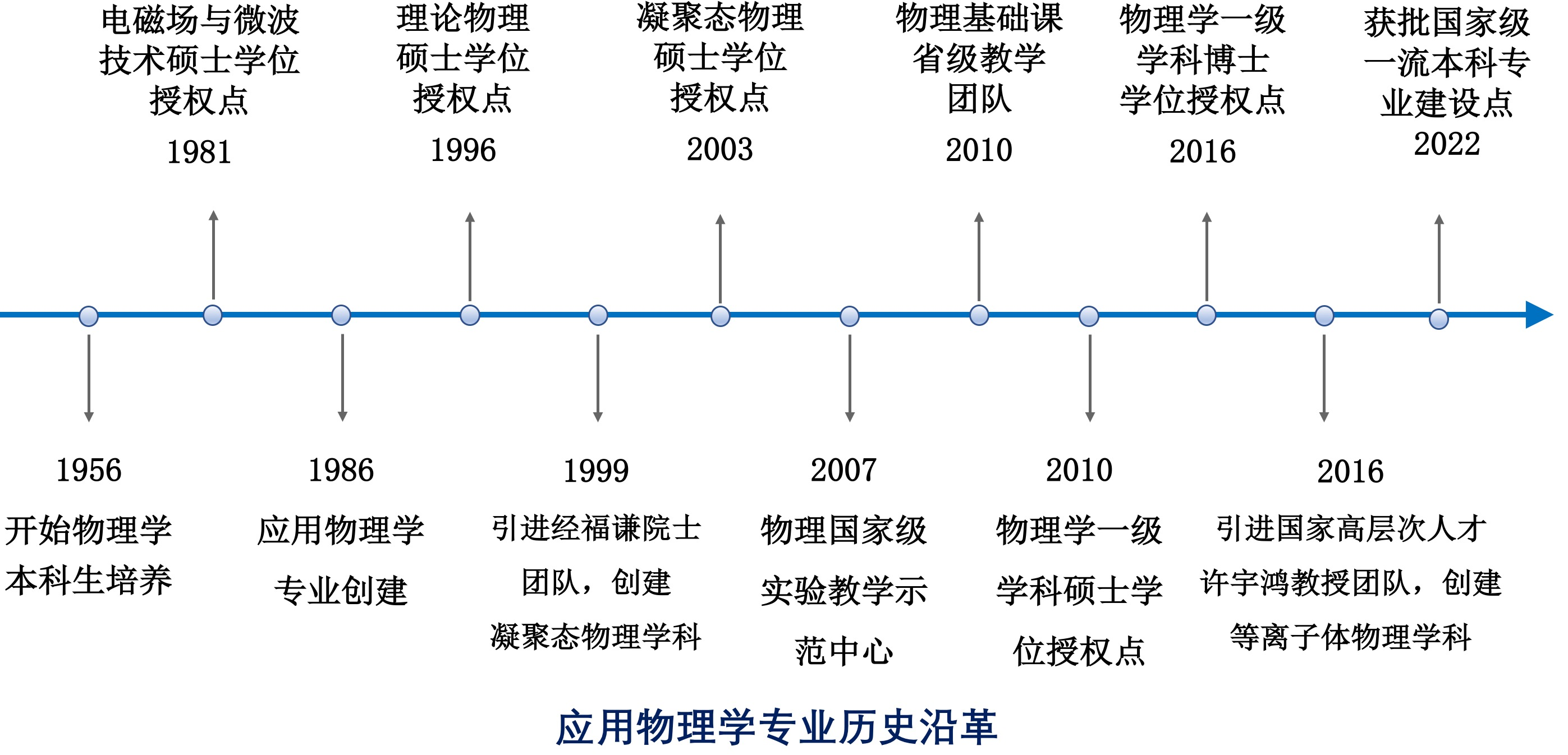 1985年西南交通大学在物理教研室的基础上成立了应用物理系,2001年成立了理学院,2008年建成了物理科学与技术学院。学校早在50年代就首先在铁路高校中开始了物理学本科生的培养,于1978年开办物理师资本科班;于1986年建立了应用物理学专业,并招收了第一届应用物理学专业本科生。后因国家需求进行了专业调整,于2010年重新招收应用物理学专业本科生,并于2022年获批国家一流专业建设点。近年来,本专业引进了多名在国内外具有影响力的物理学教授和海内外著名高校毕业的博士加盟。自2017年6月应用物理系重新设置以来,以学院综合改革为牵引,坚持以学生发展为中必,落实立德树人根本任务,努力服务于我校创建轨道交通领域世界第一的大学的目标。